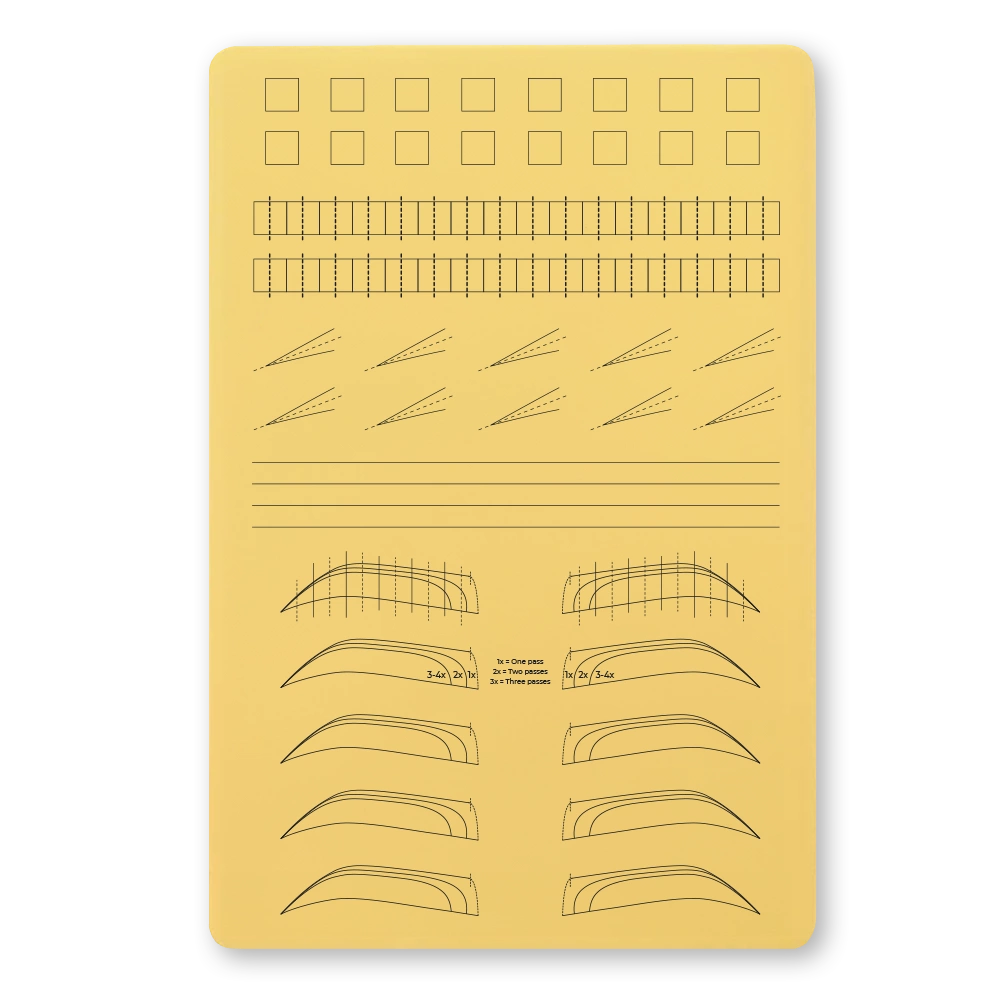 Lateksowa skórka do ćwiczeń pigmentacji brwi, segmentów, łączeń, końcówek i linii A4 jest elementem dydaktycznym służącym do ćwiczeń indywidualnych technik pigmentacji brwi.